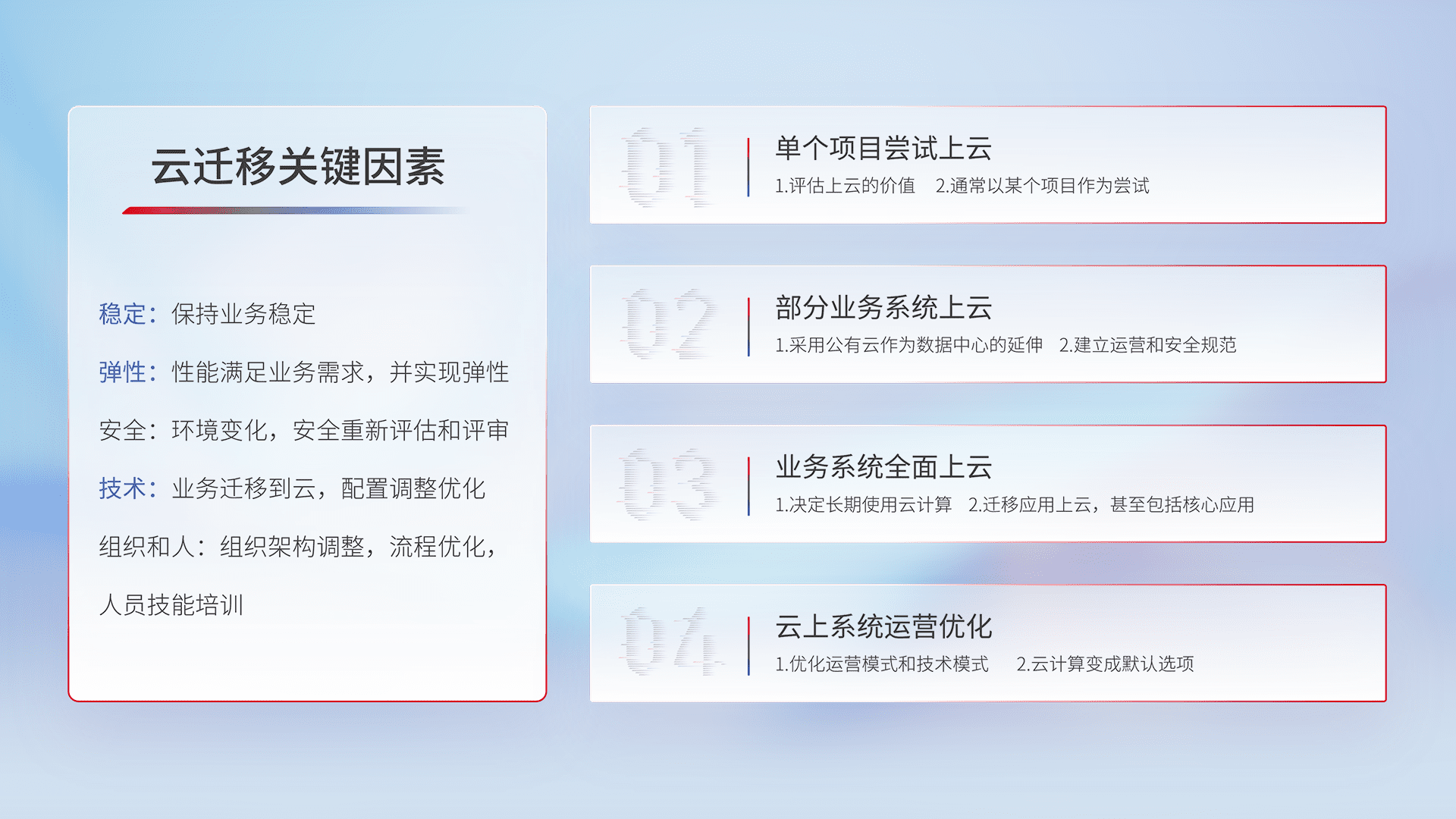结合实际业务,,从规划设计、、、云平台选型、、、、云原生改造、、、、数据迁移、、、、集成交付,,迁移全过程为客户识别最佳上云路径,,做好风险识别管理,,设计网络架构、、、身份权限、、安全审计合规、、操作审计、、、日志审计、、、、监控告警策略、、、、多站点容灾设计等,,对云上基础设施进行整体规划,,提升IT治理水平,,,以满足弹性、、、、高可用、、、高性能的需求。。