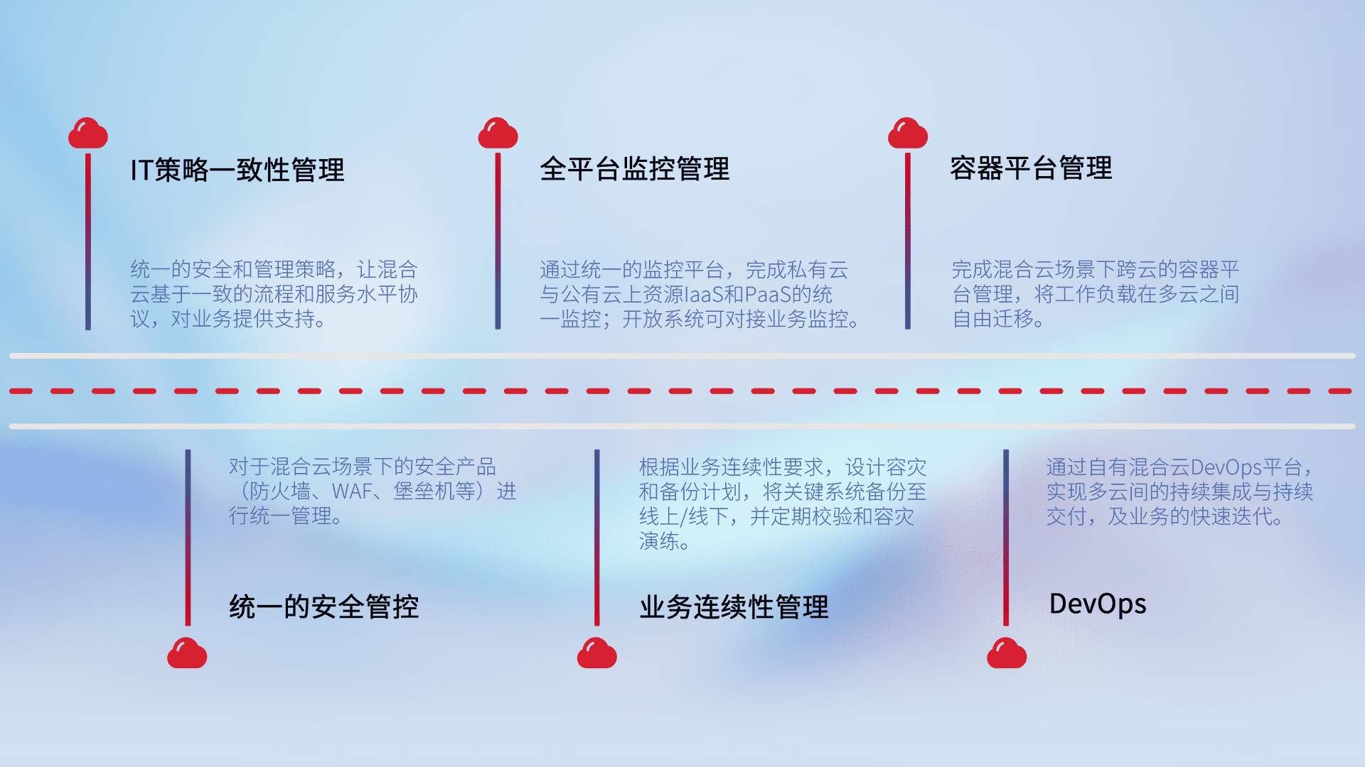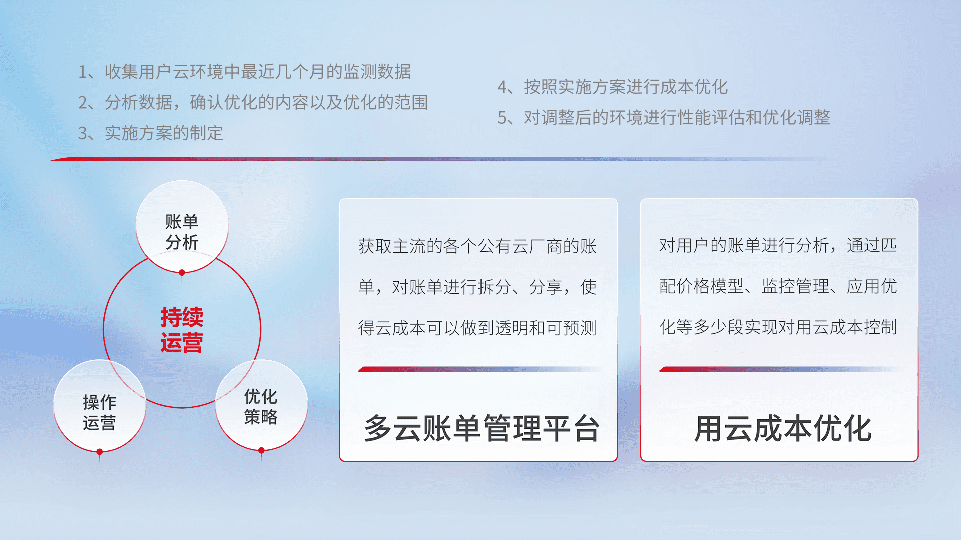 通过多云纳管,,以统一的资源数据模型把客户的云资源进行抽象和封装,,,进而实现对多云资源的统一操作,,,保障云资源管理的可靠性、、稳定性与可用性。。量身定制化运维内容,,配置、、、、开发运维、、、、补丁管理、、、备份、、、、监控、、、、认证和访问管理、、、审计和日常巡检等,,保障在用云过程中的可靠度,,稳定度以及高可用率。。