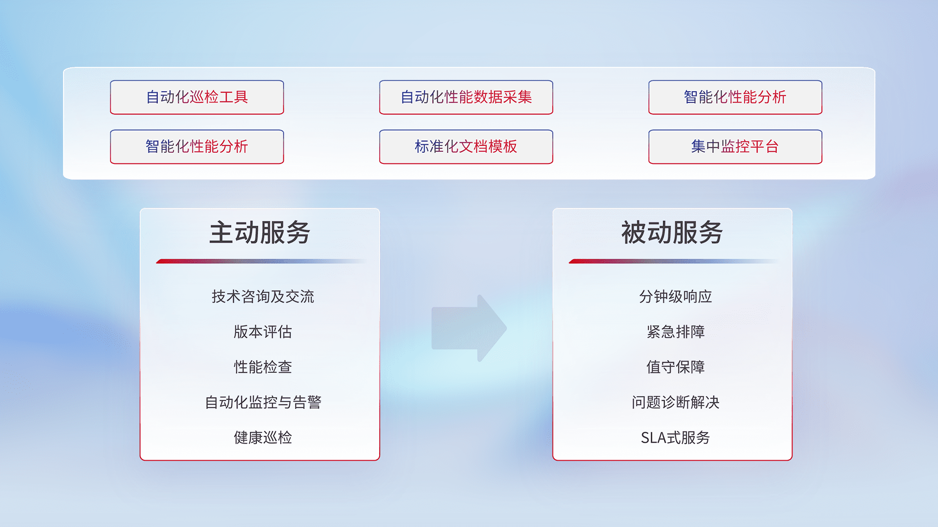 智能化工具和标准化文档,,,,保障服务质量,,,提供主动服务(包含技术咨询、、、、版本评估、、、、性能检查、、自动化监控与告警、、、、健康巡检)和被动服务包含(分钟级响应、、、、紧急排障、、、值守保障、、问题诊断解决、、、SLA服务)。。。